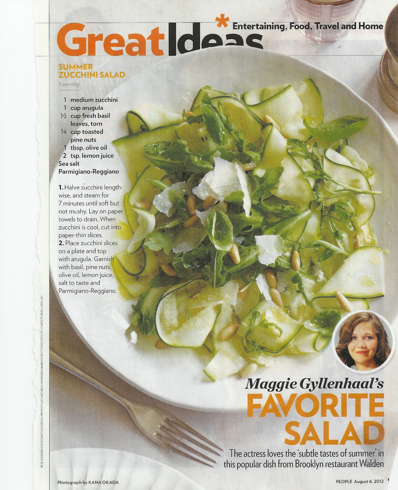 I tried this recipe by Maggie Gyllenhaal. It was delicious. It was made with arugula, ribbons of zucchini, pine nuts, parmesan cheese and an oil & lemon vinaigrette. I can’t seem to find the recipe online – but here is a scanned version.